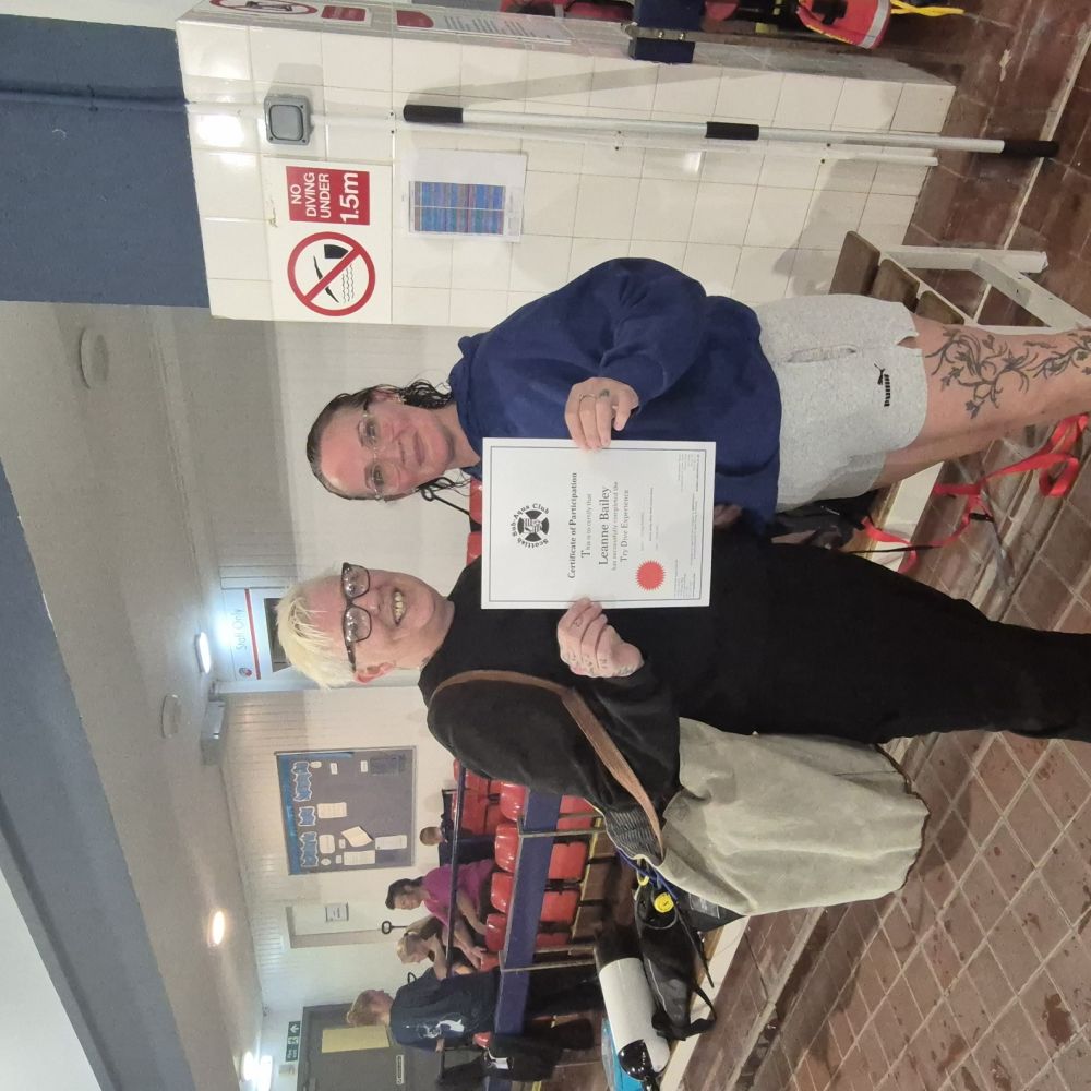 Lianne arrived at the pool full of nerves, but her excitement was clear as she chatted with other members. After meeting instructor Alan Cowan and heading into the water, she went through the usual try dive exercises, learning basic hand signals and how to breathe under water. Alan was patient and encouraging, ensuring Lianne felt comfortable every step of the way.
